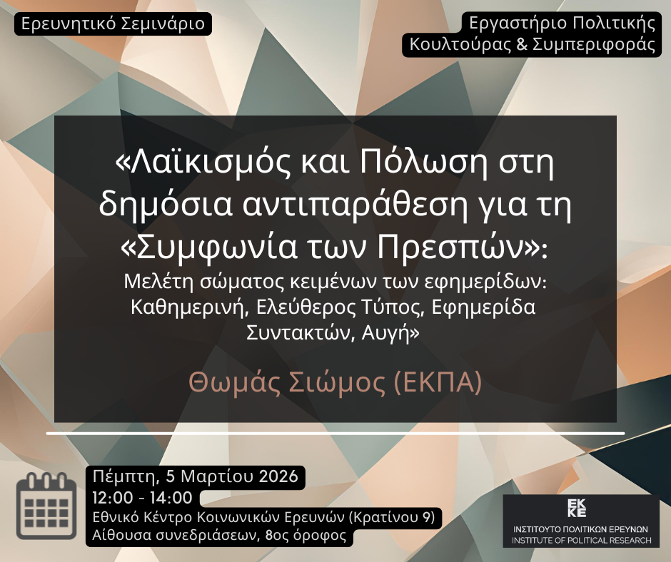 Το Εργαστήριο Πολιτικής Κουλτούρας και Συμπεριφοράς του ΕΚΚΕ σας καλεί στην 4η παρουσίαση στο πλαίσιο του Ερευνητικού του Σεμιναρίου για την τρέχουσα ακαδημαϊκή χρονιά. Εισηγητής είναι ο Θωμάς Σιώμος (Επίκουρος Καθηγητής στο Τμήμα Πολιτικών Επιστημών και Δημόσιας Διοίκησης του ΕΚΠΑ, υπό διορισμό) με τίτλο παρουσίασης: «Λαϊκισμός και Πόλωση στη δημόσια αντιπαράθεση για τη 'Συμφωνία των Πρεσπών': Μελέτη σώματος κειμένων των εφημερίδων: Καθημερινή, Ελεύθερος Τύπος, Εφημερίδα Συντακτών, Αυγή».