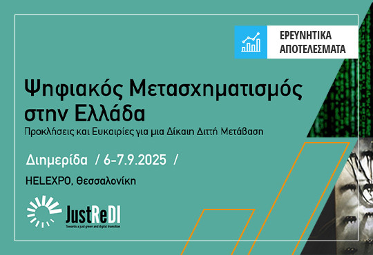 Το Σάββατο και την Κυριακή 6 και 7 Σεπτεμβρίου 2025 θα πραγματοποιηθεί στην Διεθνή Έκθεση Θεσσαλονίκης η Διημερίδα με θέμα «Ψηφιακός Μετασχηματισμός στην Ελλάδα: Προκλήσεις και Ευκαιρίες για μια Δίκαιη Διττή Μετάβαση». Η Διημερίδα, η οποία αποτελεί δράση του ερευνητικού έργου «Ανθεκτικότητα, συμπερίληψη, και ανάπτυξη: Προς μια δίκαιη πράσινη και ψηφιακή μετάβαση των ελληνικών Περιφερειών» (JustReDI), είναι αφιερωμένη στις προκλήσεις, τις ευκαιρίες και τις αναπτυξιακές προοπτικές που δημιουργούνται από την ψηφιακή μετάβαση σε όλες τις Ελληνικές Περιφέρειες, με στόχο την προώθηση ενός κοινωνικά δίκαιου και βιώσιμου ψηφιακού μετασχηματισμού.