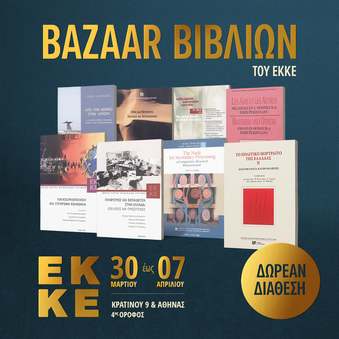 Το Εθνικό Κέντρο Κοινωνικών Ερευνών (ΕΚΚΕ), στο πλαίσιο της αξιοποίησης του εκδοτικού αποθέματός του, έχει προγραμματίσει τη δωρεάν διάθεση βιβλίων του ΕΚΚΕ και τόμων του επιστημονικού του περιοδικού, Επιθεώρηση Κοινωνικών Ερευνών. Έχει προγραμματιστεί στα γραφεία μας η διοργάνωση bazaar (δωρεάν διάθεση για κάθε ενδιαφερόμενο/-η) βιβλίων του ΕΚΚΕ από 30 Μαρτίου έως 7 Απριλίου. Ειδικά για τα μέλη του Δικτύου Επιστημονικών και Τεχνικών Βιβλιοθηκών ισχύει ότι, εάν ενδιαφέρονται, παρακαλούνται να επικοινωνήσουν με την κα Παναγιώτα Τσάνα με mail [email protected] ή/και τηλεφωνικά 210 7491705. Οι βιβλιοθήκες που βρίσκονται στην Αττική μπορούν να παραλάβουν το έντυπο υλικό για το οποίο θα εκδηλώσουν ενδιαφέρον από τα γραφείο μας Κρατίνου 9 και Αθηνάς 61, Πλατεία Κοτζιά. Οι βιβλιοθήκες που βρίσκονται εκτός Αττικής θα πρέπει να επωμιστούν τα έξοδα της αποστολής. Παρακαλούμε να επικοινωνήσετε μαζί μας μέχρι 30 Απριλίου 2026!