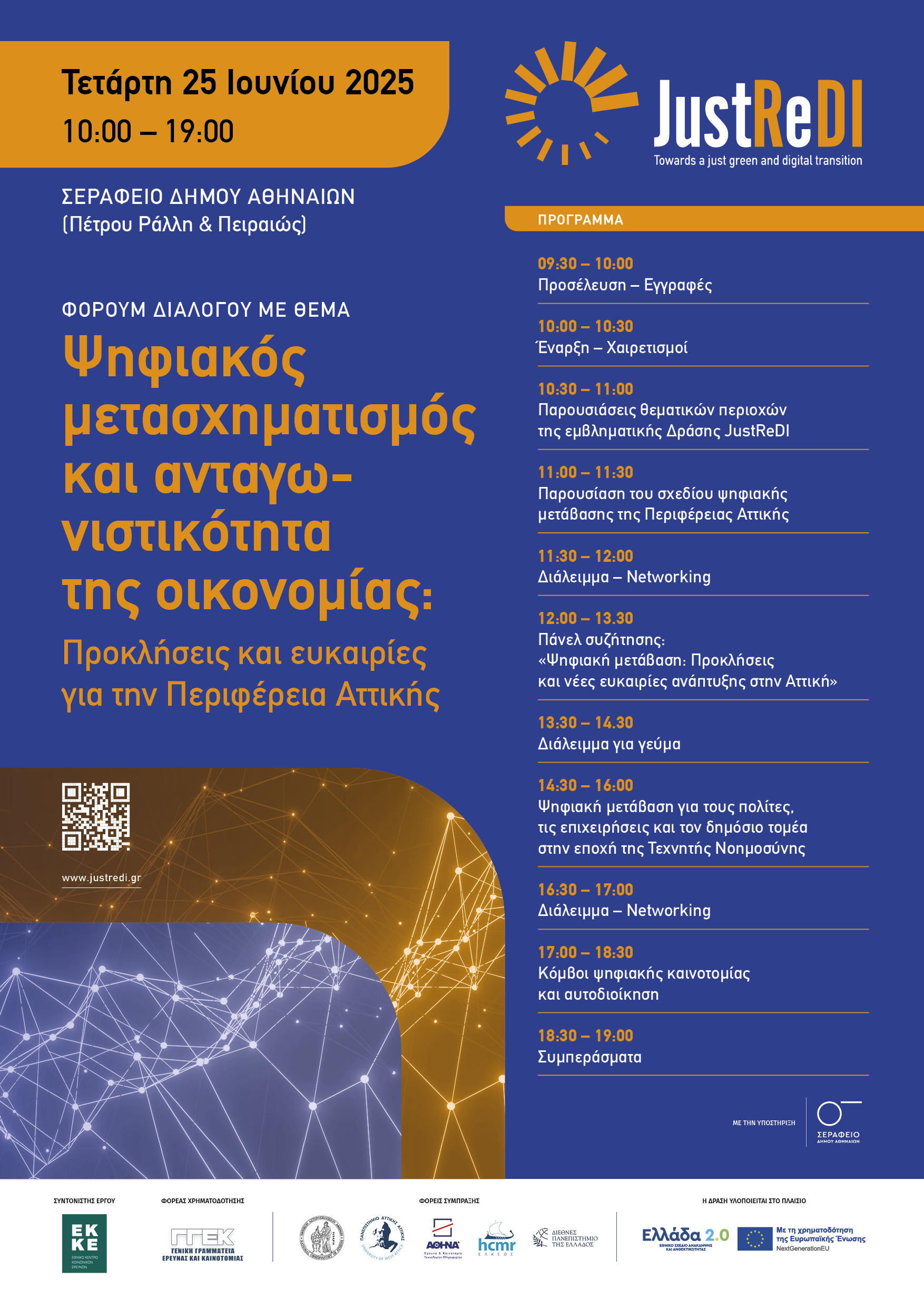 Η ημερίδα διοργανώνεται στο πλαίσιο της εμβληματικής δράσης «Ανθεκτικότητα, συμπερίληψη, και ανάπτυξη: Προς μια δίκαιη πράσινη και ψηφιακή μετάβαση των ελληνικών Περιφερειών» (JustReDI), που υλοποιείται από μια κοινοπραξία Ερευνητικών Κέντρων (ΕΚΚΕ, ΕΑΑ, ΑΘΗΝΑ, ΕΛΚΕΘΕ) και Πανεπιστημίων (ΠΑΔΑ, ΔΙΠΑΕ), και έχει στόχο να αναδείξει τις δυνατότητες και τα εμπόδια που προκύπτουν για τις τοπικές κοινωνίες και οικονομίες ενόψει της πράσινης και ψηφιακής μετάβασης.