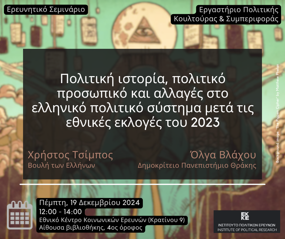 Το Εργαστήριο Πολιτικής Κουλτούρας και Συμπεριφοράς του ΕΚΚΕ σας καλεί στην 4η παρουσίαση στο πλαίσιο του Ερευνητικού του Σεμιναρίου για την τρέχουσα ακαδημαϊκή χρονιά, με τίτλο «Πολιτική ιστορία, πολιτικό προσωπικό και αλλαγές στο ελληνικό πολιτικό σύστημα μετά τις εθνικές εκλογές του 2023». Εισηγητής και εισηγήτρια: Χρήστος Τσίμπος και Όλγα Βλάχου. Η παρουσίαση θα γίνει στη Βιβλιοθήκη του ΕΚΚΕ (Κρατίνου 9, 4ος όροφος) και είναι ανοιχτή στο κοινό. Ιδιαίτερα ενθαρρύνονται να παρακολουθήσουν μεταπτυχιακοί φοιτητές/τριες και διδακτορικοί ερευνητές/τριες.