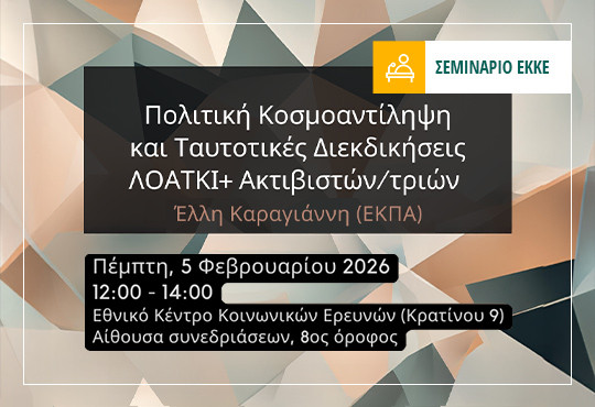 Το Εργαστήριο Πολιτικής Κουλτούρας και Συμπεριφοράς του ΕΚΚΕ σας καλεί στην 3η παρουσίαση στο πλαίσιο του Ερευνητικού του Σεμιναρίου για την τρέχουσα ακαδημαϊκή χρονιά. Εισηγήτρια είναι η Έλλη Καραγιάννη (Δρ. Εθνικού και Καποδιστριακού Πανεπιστημίου Αθηνών) με τίτλο παρουσίασης: «Πολιτική Κοσμοαντίληψη και Ταυτοτικές Διεκδικήσεις ΛΟΑΤΚΙ+ Ακτιβιστών/τριών».